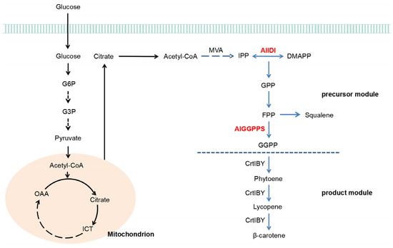 The biosynthesis of β-carotene is derived from the condensation of a universal five-carbon (C5) isoprene unit. The basic C5-isoprene building block is isopentenyl pyrophosphate (IPP; C5), which is synthesized through the mevalonate (MVA) pathway in eukaryotes or the methylerythritol (MEP) pathway in plastids and prokaryotes [10,11,12,13]. The IPP is reversibly converted into its isomer, dimethylallyl pyrophosphate (DMAPP), which is catalyzed by the isopentenyl pyrophosphate isomerase (IDI). Subsequently, the IPP condensed with DMAPP results in geranyl pyrophosphate (GPP; C10). The continuous addition of the IPP unit generates farnesyl pyrophosphate (FPP; C15) and geranylgeranyl pyrophosphate (GGPP; C20) catalyzed by the geranylgeranyl pyrophosphate synthase (GGPPS/CrtE) [14,15,16,17]. The GGPP is further recruited as the direct precursor for the synthesis of carotenoids (tetraterpene, 40C), including phytoene, lycopene and β-carotene, in turn, by using the corresponding carotenogenic enzymes [18,19,20].