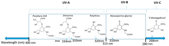 Chemical structures of mycosporine-like amino acids and their maximum absorbance values placed on the UV wavelength scale.