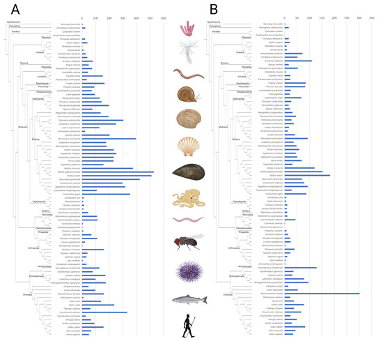 The C-type lectin-like repertoire was studied in the genomes of different representative metazoan species, and two protein types could be identified: (a) proteins containing only C-type lectin-like domains (designated CTLs), whose distribution is shown in Figure 1A, and (b) proteins containing other domains in addition to the C-type lectin-like (designated CTL domain-containing proteins, or CTLDcps), shown in Figure 1B. Regarding the CTLs, their presence was detected in all metazoan species. Only one CTL protein was detected in each poriferan species, and generally small numbers of CTL genes were found in other ancient taxa, such as choanoflagellates, platyhelminths, priapulids, and most cnidarians. Regarding deuterostomes, while humans and other chordates presented gene families with approximately 50 CTL genes, expanded CTL repertories were found in some echinoderms and chordates, such as lancelets (Branchiostoma floridae) and avians (Gallus gallus), and especially in teleost fishes, such as Salmo salar and Oreochromis_niloticus, with over 200 and 300 CTL genes. Large variations between the repertoires of species from the same phyla were observed in Arthropoda and Annelida, and large families with approximately 100 CTLs were found in the analyzed nematods, brachiopods, and phoronids. Regarding mollusks, cephalopods had a very small number of CTLs, while gastropods had more than 100 CTLs for most cases, and bivalves had the largest repertoires, with approximately 200 CTLs and up to 300–500 CTLs in many species, especially mussels and oysters. With respect to CTLDcps, the repertoires were generally smaller, below 50 genes for most species and reaching the largest numbers in some bivalves, some cnidarians, chordates, and other less-represented phyla. A striking case was the chordate lancelet (Branchiostoma floridae), with 300 CTLDcp genes.