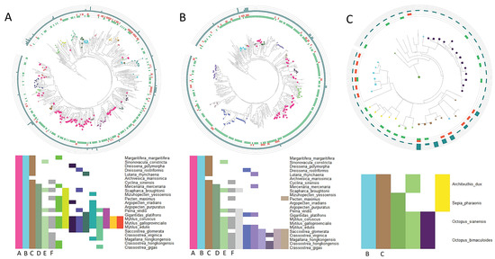 C-type lectin-like (CTL) subfamilies and their conservation across mollusks in three lineage-specific repertoires. (A): Phylogenetic analysis of C-type lectin-like proteins (CTLs) in Mytilus galloprovincialis and CTL subfamilies shared by Mytilidae mussel species. CTL orthology groups shared by the three Mytilidae species are shown, along with their conservation degree at the class level among bivalves. In the phylogenetic tree, these CTL orthology subfamilies are indicated by each color. The presence of a single peptide (green bars), the presence of a transmembrane domain (orange bars), and the number of CTL domains (outer cyan bars) are indicated for each CTL protein in the phylogenetic tree. (B): Phylogenetic analysis of CTL proteins in Crassostrea gigas and CTL subfamilies shared by all Ostreidae oyster species. Distribution in the phylogenetic tree and orthology conservation of such subfamilies between bivalves is indicated. The presence of a single peptide, the presence of transmembrane domains, and the number of CTL domains are also shown. (C): Phylogenetic analysis of CTL proteins encoded in all the analyzed cephalopod species and orthology conservation of such CTLs. The presence of a single peptide, the presences of transmembrane domains, and the number of CTL domains are also shown. By comparing the orthology conservation of each lineage-specific repertoire, two orthology subfamilies conserved at the mollusk level could be identified (B, C), as well as an additional subfamily conserved between all bivalves (A). Additionally, other subfamilies were shared between the two bivalve lineage-specific repertoires of mussels and oysters (D, E, F).