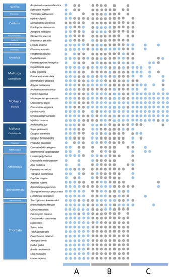 Orthology analysis of proteins containing C-type lectin-like domains in addition to other domains (CTLDcps). For a subset of the analyzed metazoan species, the conservation of several CTLDcps orthology groups is indicated: blue: orthologs including the CTL domain; gray: orthologs without the CTL domain. Three large categories were revealed: (A) orthology groups/gene families containing CTL domains across all metazoans and conserved in vertebrates; (B) gene families containing CTL domains in some metazoans (especially bivalves) while the CTL domains were lost from the ortholog genes of other species (completely lost in vertebrates); (C) CTLDcps gene families unique in bivalves, without clear orthology in other metazoan clades.