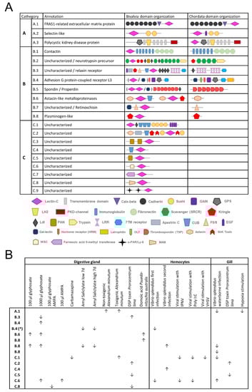 Domain architecture and transcriptomic modulation of some C-type lectin-like domain-containing protein (CTLDcp) bivalve gene families. (A): To exemplify the obtained results, several gene families were chosen as examples for the three categories of CTLDcps presented in Figure 6. The annotation of each gene family is indicated, along with the domain architecture found in mussels (as an example of bivalves) and in human orthologs (as an example of vertebrates). The general conservation of CTL domains in both orthologs could be observed in category “A” CTLDcps, while the lectin domain was lost from the vertebrate orthologs of category “B”. CTLDcps from categories “B” and “C” included unique domain architectures found in bivalves and corresponded mainly to uncharacterized proteins that could be of interest for future research. (B): The transcriptomic modulation (p value < 0.05) found for the mussel CTLDcps collected in Panel A is shown. Samples corresponding to each transcriptomic experiment are indicated in Supplementary File S3. *, Gal-lectin domain instead of C-type lectin domain; ↑, up-modulated expression; ↓, down-modulated expression.