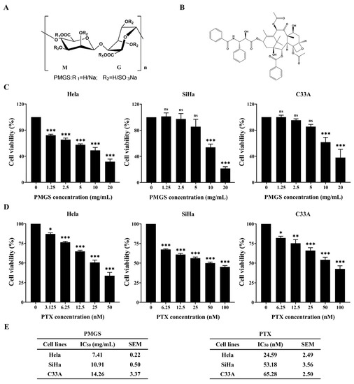 Cytotoxic activity analysis of PMGS and PTX in cervical cancer cells. (A) Chemical structure of PMGS. (B) Chemical structure of PTX. (C,D) CCK-8 assay was performed to detect cell viability in Hela, SiHa, and C33A cells 48 h after cells were treated with PMGS (C) or PTX (D). (E) The IC50 values of PMGS and PTX in Hela, SiHa, and C33A cells. Error bars, SEM. ns, not significant; * p < 0.05; ** p < 0.01; *** p < 0.001.
