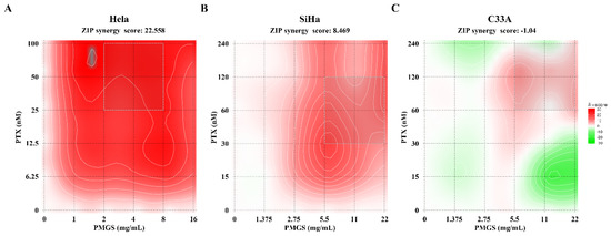 Side effects restrain the application of chemotherapies in clinic. Therefore, to improve drug efficacy, as well as reduce adverse effects, we tested whether PMGS could synergize with PTX in the treatment of cervical cancer. According to the IC50 values of PMGS and PTX, we designed a dose-range experiment and detected cell viability, in which dose-escalating PMGS (0–22 mg/mL) and PTX (0–240 nM) were added to Hela, SiHa, and C33A cells alone or in combination (Supplementary Tables S2–S4). The online SynergyFinder software was then used to calculate the ZIP synergy scores based on the viability index (Figure 2). The results show that the average drug interaction scores were 22.558 in the Hela cells, 8.469 in the SiHa cells, and −1.04 in the C33A cells. Collectively, the combination of PMGS and PTX displayed significant synergistic effects in the Hela cells rather than in the SiHa and C33A cells (ZIP synergy scores > 10).