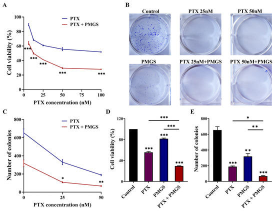 To detect cell proliferation after the different treatments, with either PTX (25 nM, 50 nM) or PMGS (2 mg/mL) alone or in combination, a colony formation assay was performed. The cells (2 × 103/well) were seeded into 6-well plates; then, a fresh culture medium with the different treatments was added and replaced every 3 days for approximately 12 days until the colonies contained over 50 cells. The colonies were fixed with 4% paraformaldehyde (P1110, Solarbio, Beijing, China) and stained with 0.1% crystal violet (G1063, Solarbio). The colony formation number was quantified using ImageJ software (version 1.52a, National Institutes of Health, Bethesda, MD, USA).