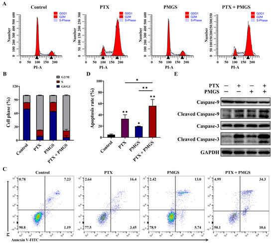 An Annexin V-FITC/PI staining assay was also performed to detect cell apoptosis. The results show that PMGS or PTX alone induced cell apoptosis to a certain extent, while PMGS combined with PTX further promoted apoptosis in the Hela cells (Figure 4C,D).