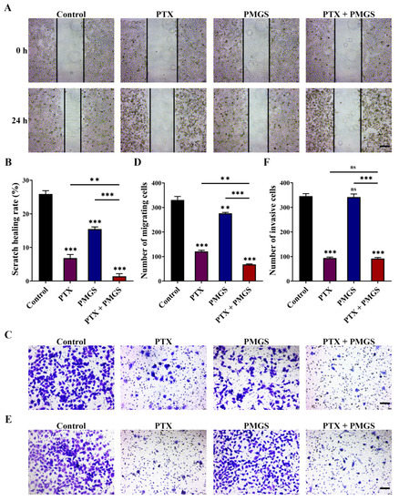 Cell migration was estimated via a wound-healing assay as described previously [30]. In short, the cells were seeded on 6-well plates and cultured until reaching confluence, and then a sterile 200 μL pipette tip was used to scrape a line in the cellular monolayer. After the cell debris was abolished, the cellular monolayer was incubated with either PMGS (2 mg/mL) or PTX (50 nM) alone or in combination for 24 h. Images were captured under an inverted microscope (ECLIPSE Ts2, Nikon, Tokyo, Japan) at 0 and 24 h after scratching. ImageJ software (version 1.52a, National Institutes of Health) was utilized to quantify the rate of wound closure.