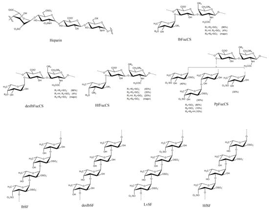 LvSF is a sulfated fucan isolated from the sea urchin Lytechinus variegatus and has a structure of [→3)-α-Fuc2,4S-(1→3)-αFuc2S-(1→3)-α-Fuc2S-(1→3)-α-Fuc4S-(1→]n [], while PpFucCS is the fucosylated chondroitin sulfate isolated from the sea cucumber Pentacta pygmaea and has a structure of [→3)-β-GalNAcX(1→4)-β-GlcA-[(3→1)Y]-(1→]n, where X = 4S (80%), 6S (10%), or non-sulfated (10%), and Y = α-Fuc2,4S (40%), αFuc2,4S-(1→4)-α-Fuc (30%), or α-Fuc4S (30%) [] (Figure 1).