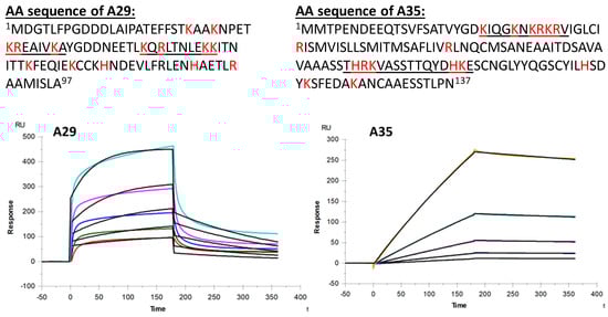Amino acid sequence of MPXV A29 and A35 proteins (positively charged amino acids histidine (H), lysine (K), and arginine (R) are in red) and SPR sensorgrams of MPXV A29 and A35 protein binding with heparin. Concentrations of A35 protein were 1000, 500, 250, 125, 62.5 and 31.3 nM (from top to bottom, respectively).