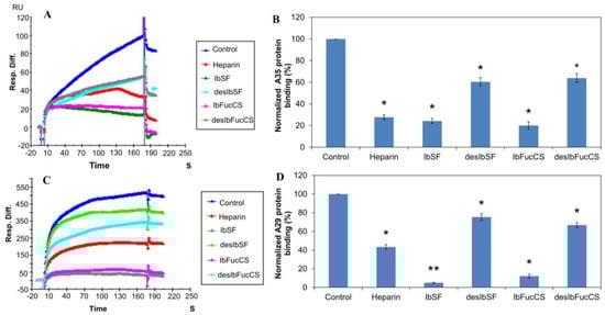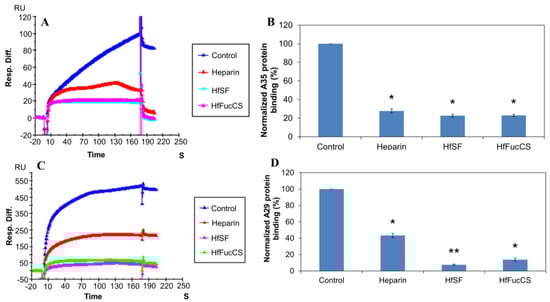 Solution/surface competition experiments were performed using SPR to study the ability of HfSF and HfFucCS to inhibit the interactions between heparin with the MPXV A29 and A35 proteins. The same concentration of Hf glycan (100 µg/mL) was individually mixed in the MPXV A29 or A35 proteins (250 nM). Solution competition study results between heparin and Hf glycans are shown in Figure 4. Heparin inhibited the binding of MPXV A29 and A35 binding to surface-immobilized heparin by 60% and 72%, respectively. IbSF and IbFucCS showed slightly better results for the inhibitions of A35 binding to surface-immobilized heparin, with 77.4% and 77%, respectively. However, IbSF and IbFucCS showed strong competitive inhibition results, with 92.4% and 86.1%, respectively.