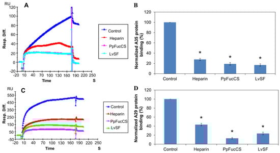 Solution/surface competition experiments were performed using SPR to study the inhibition of LvSF and PpFucCS for the interaction between heparin with MPXV A29 and A35 proteins. The same concentration of Hf glycan (100 µg/mL) was individually mixed in the MPXV A29 or A35 proteins (250 nM). The solution competition study results between heparin and sulfated glycans are shown in Figure 5. Heparin inhibited the binding of MPXV A29 and A35 to surface-immobilized heparin by 60% and 72%, respectively. LvSF and PpFucCS showed a better result of the inhibition of A35′s binding to surface-immobilized heparin, with 83.1% and 89%, respectively. LvSF and PpSFucCS showed strong competitive inhibition results, with 76.4% and 87%, respectively.