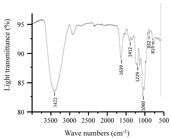 Our previous research showed that PHP is composed of a repeating structure of alternating (1→4)-linked 3,6-anhydro-α-L-galactopyranose units or (1→4)-linked α-l-galactose 6 sulfate units [22]. In this study, the structure of purified PHP was analyzed to reconfirm whether different batches of extraction and purification processes make difference in structural changes in PHP or not. The sugar composition of PHP was analyzed using GC-MS, revealing a ratio of 1.2:1.0 for galactose and 3,6-anhydrogalactose. Additionally, the total sulfate content of PHP was found to be 5.8% ± 0.42. PHP has a molecular weight of 2.01 × 105 Da. The analysis of the structure of polysaccharides, including functional groups and glycosidic bonds, can be effectively carried out using FT-IR, which is a reliable technique. The FT-IR spectrum of PHP is shown in Figure 1. The results revealed that PHP had typical signals of porphyran, such as at 3422, 1639, 1412, 1229, 1060, 932, and 819 cm−1 [24]. The weak band 932 cm−1 was attributed to the absorption of 3,6-anhydrogalactose and 819 cm−1 was assigned to the absorption of the sulfate group attached at the C-6 position of galactose [25]. The results are consistent with our previous study.