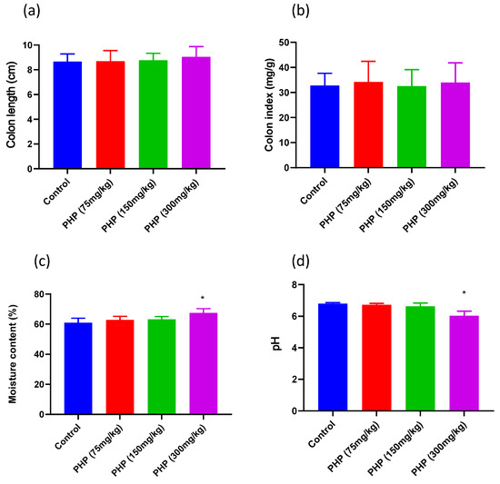 Effects of PHP on intestinal physiological status in mice (n = 6). (a) Colon length, (b) colon index, (c) moisture content, and (d) pH value. Values are expressed as mean ± SD. * p < 0.05 vs. Control group.