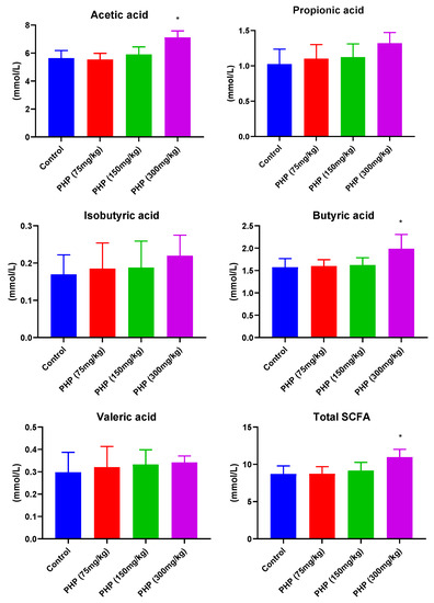 Effects of PHP on the concentration of SCFAs in the colon luminal contents of mice (n = 6). Values are expressed as mean ± SD. * p < 0.05 vs. Control group.