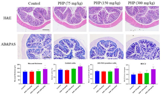 AB&PAS staining is a laboratory technique used to detect and evaluate the presence of mucin-producing cells and mucin deposition in tissues. Mucins are glycoproteins that are present in various tissues throughout the body, including the respiratory and gastrointestinal tracts [33]. In the gastrointestinal tract, mucins form a protective barrier between the epithelial cells that line the intestinal wall and the potentially harmful contents of the gut, such as digestive enzymes and microorganisms. Mucins are produced and secreted by goblet cells, which are found in the epithelial lining of various tissues. As shown in Figure 4, the proportion of goblet cells in the PHP (300 mg/kg) group was considerably greater compared to the control group (p < 0.05). Moreover, the AB-PAS staining demonstrated a greater area of positive staining for mucins in the group receiving PHP (300 mg/kg) compared to the control group.