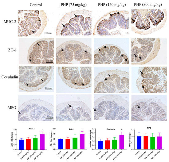 The intestinal barrier also contains immune cells that help to identify and neutralize potential threats [39]. Neutrophils are a type of immune cell that plays a critical role in fighting bacterial and fungal infections [40]. However, excessive neutrophil infiltration can also be harmful and contribute to tissue damage and inflammation. MPO is an enzyme released by neutrophils and helps to destroy invading microorganisms by producing hypochlorous acid and other free radicals [41]. These compounds are toxic to bacteria and fungi and can help to kill them. However, excessive MPO activity can also contribute to tissue damage and inflammation. In some inflammatory conditions, such as atherosclerosis, asthma, and inflammatory bowel disease, MPO has been shown to promote oxidative stress and inflammation, leading to tissue damage. Therefore, the role of MPO in the intestinal barrier is complex and context-dependent. Maintaining a balanced and controlled immune response is crucial for the maintenance of the intestinal barrier and the prevention of inflammatory diseases. The expression of MPO was evaluated by immunohistochemistry. However, the PHP (300 mg/kg) group demonstrated no significant difference in the expression of MPO compared to the control group (Figure 5).