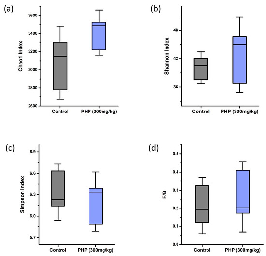 Seaweed polysaccharides cannot be digested by intestinal enzymes, which permit them to reach the large intestine to selectively ferment by intestinal microbes, consequently impelling the nutrition absorption, energy spending, and immune system of the host [42]. In this study, the regulatory effects of PHP on intestinal microbiota were evaluated through metagenomic analyses by 16S rRNA sequencing. Alpha diversity is an important measure of the diversity and complexity of the microbial communities within the gut. A high level of alpha diversity within the gut microbiota is generally considered to be a marker of a healthy gut, as it indicates a more diverse and stable microbial community with a greater number of species able to survive and thrive within the gut environment. There are several different ways to measure the alpha diversity of gut microbiota, including the calculation of diversity indices such as the Chao1 index, Shannon index, and Simpson index. The Chao1 index is a commonly used metric for estimating the species richness of microbial communities, including the gut microbiota. The Shannon index and the Simpson index are two commonly used diversity indices for measuring the diversity of microbiota. The Shannon index takes into account both the number of different species present in a microbial community and the relative abundance of each species. The Simpson index, on the other hand, is a measure of the dominance of a few highly abundant species in a community. As shown in Figure 6a,b, the Chao1 index and Shannon index in the PHP (300 mg/kg) group were higher than those in the control group. This suggested that the intake of PHP increased the richness and diversity of gut microbiota in mice.