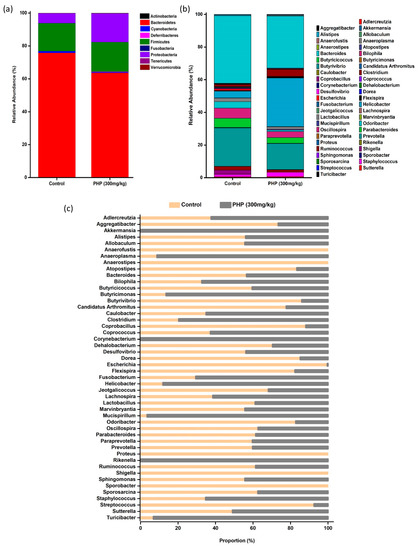 The composition of intestinal flora in mice at the phylum level is shown in Figure 7a. Nine distinct phyla were detected. Among them, Bacteroidetes, Firmicutes, and Proteobacteria are predominant, while Actinobacteria, Cyanobacteria, Deferribacteres, fusobacteria, tenericutes, and verrucomicrobia are less abundant. The Firmicutes to Bacteroidetes ratio (F/B ratio) is a commonly used metric for assessing the composition of the gut microbiota. Firmicutes and Bacteroidetes are two of the most prevalent bacterial phyla identified in the human gut, and their relative abundance can be used to provide insight into the overall composition and potential function of the microbiota. A higher F/B ratio has been linked to increased production of SCFAs, which can have anti-inflammatory effects and may play a role in maintaining gut health [43]. As shown in Figure 7a, the relative abundance of firmicutes in the control and PHP-treated groups showed similarly, and no significant changes were observed, whereas the relative abundance of Bacteroidetes in the PHP-treated group decreased compared to the control. Therefore, the F/B ratio in the PHP (300 mg/kg) group was lower than that in the control group (Figure 6d). Other than Firmicutes and Bacteroidetes, a noticeably increased relative abundance of Proteobacteria was observed in the PHP (300 mg/kg) group. Some strains of Proteobacteria also have been shown to produce antimicrobial compounds that can inhibit the growth of pathogenic bacteria, therefore helping to maintain the balance of the gut microbiota [44]. Moreover, a slight decrease in the abundance of Cyanobacteria was observed in the PHP-treated group. Studies have shown that Cyanobacteria can interact with intestinal epithelial cells and disrupt the integrity of the gut barrier. A decrease in the abundance of Cyanobacteria can therefore help to improve gut barrier function and reduce the risk of leaky-gut syndrome [45].
