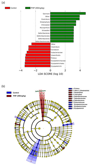 Linear discriminant analysis effect size (LefSe) is a statistical method used to identify the features that are differentially abundant between two or more groups. It is commonly used in microbiome studies to identify biomarkers or taxa that are associated with specific clinical or environmental conditions. The output of LefSe includes the effect size, which measures the strength and direction of the difference between groups, and the LDA score, which is a measure of the statistical significance of the effect size. As shown in Figure 8, there were significant differences between the groups’ predominant taxa of intestinal microflorae by setting 4.0 as the LDA score. Among them, the class of Deferribacteres was found to be dominant in the PHP group, which was one of the main bacterial groups responsible to produce butyrate in the human colon [54]. In contrast, the class of Erysipelotrichia was dominant in the control group, which has been implicated in the development of inflammatory bowel disease and other gut-related disorders [55]. Moreover, the Clostridium genus was found to be common in both control and PHP-treated groups. Some strains of Clostridium are beneficial, helping to ferment dietary fibers and produce beneficial SCFAs [56].