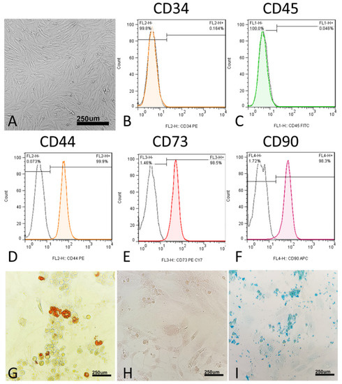 Characterization of human umbilical cord mesenchymal stromal/stem cells (hUC-MSCs). (A) hUC-MSCs’ morphology. Flow cytometric histograms showing the immunophenotype of hUC-MSCs. (B,C) hUC-MSCs are negative for the hematopoietic line markers CD34 and CD45. (D–F) Analyzed hUC-MSCs are positive for CD44, CD73, and CD90, which are considered to be markers of MSCs. FITC, fluorescein isothiocyanate; PE, phycoerythrin; Cy7, Sulfo-Cyanine7; APC, Allophycocyanin. (G–I) Differentiation of hUC-MSCs to adipogenic differentiation, in which the cells were stained with oil red O, osteogenic differentiation, in which the cells were stained with alizarin red, and chondrogenic differentiation, in which the cells were stained with Alcian blue.