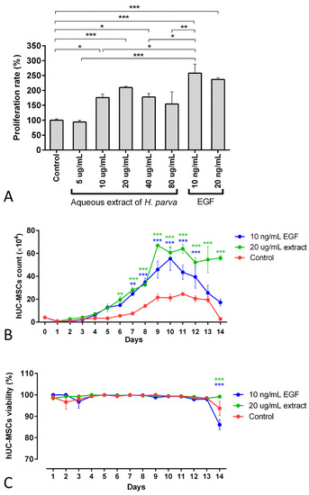 The number of cells treated with the 20 µg/mL concentration of the extract and EGF-10 increased faster and higher than in the control group (Figure 3B). In detail, the cell number of the extract treatment group was higher than the control group from day 6 (p < 0.01). Moreover, this result was observed for the EGF-10 treatment group from day 7 (p < 0.01). On the other hand, the 20 µg/mL concentration of aqueous extract of H. parva and EGF-10 did not have significant effects on hUC-MSCs’ viability compared to the control group for 13 days (Figure 3C).