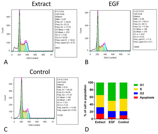 Treated hUC-MSCs with 20 µg/mL aqueous extract or 10 ng/mL EGF for 72 h were harvested at 80–90% confluence for cell cycle analysis. The cell concentration was adjusted to 5 × 105 cell/mL. Cells were washed with PBS 1X and were fixed with 70% ethanol at 4 °C for 2 h. Fixed cells were centrifuged, and the supernatant was discarded. The pellet was washed and incubated in a 1 mL:propidium iodide (PI) master mix included 40 μL of PI, 10 μL of RNase (DNase free), and 950 μL of PBS for 30 min. Cell cycles were assessed by flow cytometry, and analysis was performed using FlowJo software (Tree Star Inc., Ashland, Wilmington, DE, USA) [67].