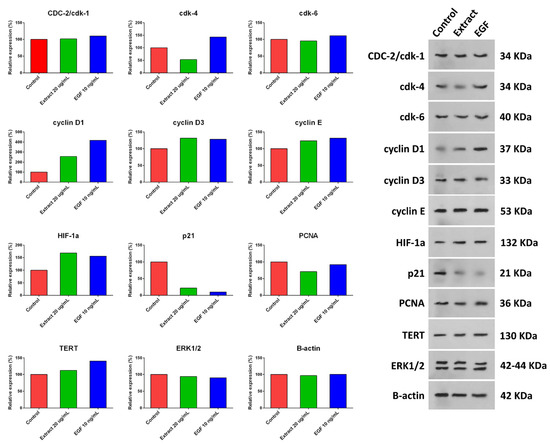 hUC-MSCs were treated with a 20 µg/mL concentration of aqueous extract of H. parva or EGF-10, and expression of cyclin D1, cyclin D3, cyclin E, HIF-1α, and TERT were increased compared with the control group (Figure 5 and Figure S9). Moreover, the expression of p21 and PCNA decreased after treating hUC-MSCs with a 20 µg/mL concentration of aqueous extract of H. parva or EGF-10 compared with the control group. However, CDC-2/cdk-1 and ERK1/2 had almost the same expression as the control group. The expression of CDK-4 was decreased and increased after treatment with the extract and EGF-10, respectively. In addition, CDK-6 expression was decreased and increased after cell treatment with the extract and EGF-10, respectively.