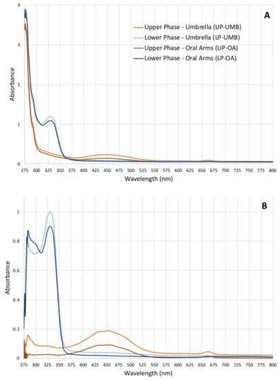 Given the lack of literature data on the possible compounds present in the hydroalcoholic extract fractions and of related analyses for their identification, a simple qualitative analysis of the upper phase (UP) and the lower phase (LP) was first performed to rapidly identify compound categories rather than individual compounds. Both the absorbance and fluorescence spectra were measured (from ultraviolet to near infra-red region) for both the upper and lower phases from OA and UMB samples of jellyfish. The absorbance spectra of both the upper phases (umbrella and oral arms) were similar (Figure 1) and revealed three different absorbance regions: a high-absorbance region from 230 to 280 nm where peptide bonds in proteins and free amino acids have maximum absorption [51,52], a broad-shaped peak at 453 nm (400–500 nm), and a third, weaker absorption peak at 663 nm (650–675 nm). The last two peaks correspond to the characteristic absorption spectra of the photosynthetic pigments and are related to chlorophylls, carotenoids, and pigment–protein complexes [53,54]. The absorbance spectra of the lower phases of UMB and OA were also similar to each other, revealing two peaks at 280 nm and 329 nm (310–340 nm). Although the compounds were not identified by this analysis, these spectra fall within the UV absorbance ranges of subfamilies of phenolics, i.e., phenolic acids (270–280 nm and 305–330 nm), and flavonoids (270–280 and 310–350 nm).