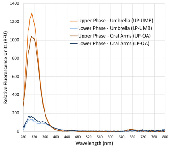 Fluorescence spectra (Figure 2) revealed a difference between the upper and lower phases of both the extracts from the C. andromeda umbrella and oral arms. Both the upper phases (UP-UMB and UP-OA) have a fluorescence emission between 280 and 380 nm, which was much less evident for LPs. Fluorescent values were of 1250 and 1000 RFU (relative fluorescence units) for the upper phases of the umbrella and oral arms, respectively, and about 125 and 150 RFU for the lower phases of the umbrella and oral arms, respectively. Wolf and Stevens (1967) [55] reported that carotenoid such as β-carotene and lutein emitted fluorescence in the range 300–400 nm upon excitation at 280 nm; however, wide varieties of natural molecules are characterized by fluorescence in these regions of the electromagnetic spectrum [56]. In addition, some synthetic compounds such as polycyclic aromatic hydrocarbons (PAH) or pesticides emit fluorescence in the same range under excitation at a wavelength of 280 nm, and they can be easily adsorbed by the benthic Cassiopea andromeda, especially from polluted sediments such as those of port seabeds [57,58,59]. Analyses for the identification of the involved chemical species are still in progress in order to identify both useful and dangerous compounds. Weak peaks (less than 25–50 RFU) were also detectable in the range 650–700 nm, which is typical of a fluorescence spectrum of chlorophyll-a [56,60].