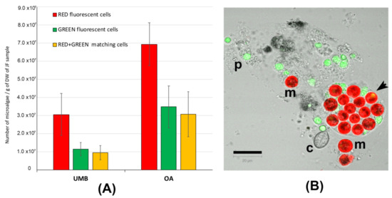 In Figure S1, representative pictures of the density of microalgae symbiont in the umbrella (A) and oral arm tissues (B) are shown. Figure 3 shows the number of red-fluorescent cells, green-fluorescent particles, and cells showing both red and green autofluorescence (Figure 3A). Figure 3B is a representative picture of the lyophilized tissue resuspended in seawater and detected by confocal microscopy. Microalgae (m) containing the red-autofluorescent chloroplasts are evident as well as a number of heterogenous particles (p), including some cnidocytes, also showing green autofluorescence; an untriggered cnidocyst is also visible (c). In addition to the red-autofluorescent chloroplast, several microalgae show a corpuscle with a bright-green autofluorescence inside the cell (arrow in Figure 3B), as also found in C. tuberculata [4]. Only the round-shaped red-autofluorescent cells with a diameter around 10 μm were considered as microalgal cells and considered in the counting. The number of zooxanthellae was significantly (p < 0.001) higher in the oral arms (OA) than in the umbrella (UMB) tissues. This is obviously due to the phenotypic trait of the C. andromeda, which exposes the oral arms to the light and also may justify the different content in proteins and phenol compounds detected in the oral arms as compared to umbrella tissues (Table 2 and Table 3). However, in our experimental conditions, the difference in zooxanthellae amount between UMB and OA is not supported by a significant difference in antioxidant activity (Table 4).