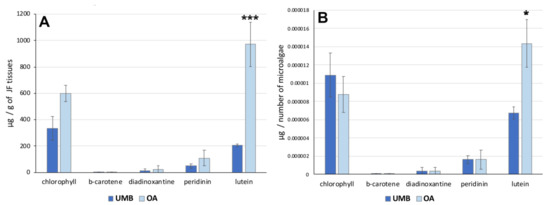 Figure 4. (A) Graphs showing the concentration of pigments in the tissues of the umbrella (UMB) and oral arms (OA) of C. andromeda as expressed as mg per mg of lyophilized tissue (A) and per number of microalgae (B). Statistical analysis: two-way ANOVA test (p < 0.05) followed by Bonferroni test. Significant differences between UMB or OA are indicated with * for values of p < 0.05 and with *** for p < 0.001.
