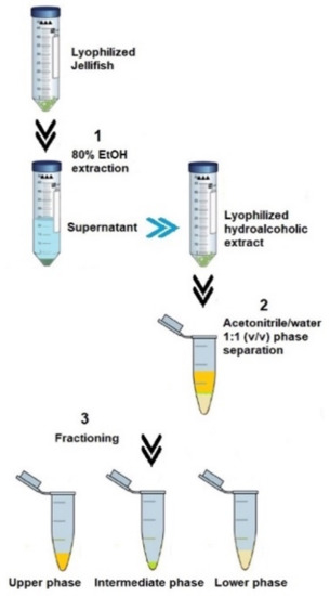 The total jellyfish hydroalcoholic extracts (80% ethanol) contain a mixture of heterogeneous compounds. In order to obtain partially purified fractions, a first separation was performed by protein precipitation. A 50% acetonitrile (ACN) solution was used to efficiently precipitate proteins larger than ~40 kDa [4]. This phase-separation methodology was used for the first time to partially characterize the complex hydroalcoholic extract of the whole jellyfish Cotylorhiza tuberculata [4]. This method is useful for separating different classes of components eventually present in hydroalcoholic-soluble extracts of complex samples, such as biomass of zooxanthellate jellyfish. Indeed, the use of a mild organic solvent (FDA, 2012) such as the solution acetonitrile/water (ACN:H2O) and the avoidance of freeze–thaw cycles, which are damaging the structures of bioactive compounds, resulted in an advantageous method for composite organisms such as holobionts [4].