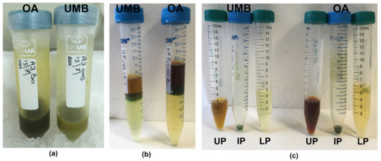 Figure 6. Steps of extraction and fractionation of the hydroalcoholic extracts (a) from the umbrella (UMB) and oral arms (OA) of C. andromeda jellyfish. Phase separation after ACN/H2O precipitation (b) and separated phases (c). UP, upper phase; IP, intermediate phase; LP, lower phase.