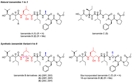 In 2018, izenamides A-C (1–3), which are linear depsipeptides, were first isolated from the marine cyanobacterium 1605-5 by Suenaga et al [18] (Figure 1). Izenamides A (1) and B (2) contain four amino acids (Pro-O-Me, N-Me-Phe, Ala, and Ile); two α-hydroxy acids (two valic acids for 1, and one valic acid and one isoleucic acid for 2); and a γ-amino-β-hydroxy acid moiety known as statine [(3S,4S)-4-amino-3-hydroxy-6-methylheptanoic acid, Sta]. Izenamide C (3) also contains Pro-O-Me, N-Me-Phe, Ile, and valic acid; however, it contains Gly in place of Ala in 1 and 2, as well as isoleucic acid. Unlike izenamides A (1) and B (2), izenamide C (3) lacks a Sta unit in the peptide backbone. Interestingly, izenamides A (1) and B (2) show moderate inhibitory activities against CTSD in vitro, whereas izenamide C (3) does not show CTSD inhibition. From a structural standpoint, modified peptidic CTSD inhibitors, including pepstatin A [19,20], tasiamides [21,22,23], grassystatins [24,25], and phormidepistatin [26], also possess Sta and Sta-like moieties for the inhibition of aspartic proteases, suggesting the role of the Sta unit (in 1 and 2) in CTSD inhibition.
