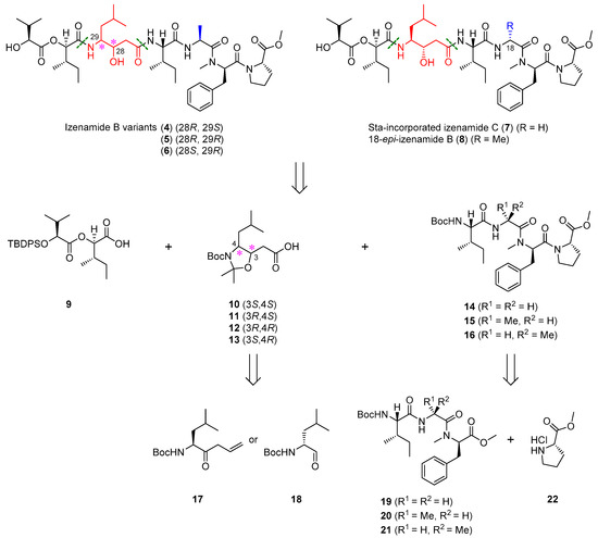 The synthetic strategy for the novel izenamide variants (4–6) is outlined in Scheme 1, focusing on the diastereomeric modification of the natural Sta and alanine units in izenamide B (2). The envisioned approach involves the convergent assembly of three fragments: tetrapeptides 14–16, diastereomeric Sta precursors 11–13, and acid 9. Tetrapeptides 14–16 were anticipated to be derived from tripeptide 19–21. The diastereomers of Sta precursors 11–13 as key fragments would be conveniently prepared from the known ketone 17 or aldehyde 18. Similarly, izenamide variants (7) and (8) could be synthesized by the amide coupling of tetrapeptide 14 or 15, natural Sta precursor 10, and acid 9. Tetrapeptide 15 was prepared from tripeptide 20. Fragments 9, 10, 14, and 16 were readily prepared as previously described [27].