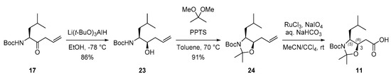 The synthesis of variants 4–6 was initiated by preparing diastereomeric Sta precursors 11–13 to investigate the stereochemical effects of the two stereocenters in the Sta unit on CTSD inhibition. First, the C3-epimeric Sta precursor (3R,4S)-11 was synthesized, as illustrated in Scheme 2. The diastereoselective reduction of ketone 17 [28] with Li(t-BuO)3AlH exclusively afforded alcohol 23 [28], which was subsequently protected with 2,2-dimethoxypropane in the presence of catalytic PPTS. Finally, the desired C3-epimeric Sta precursor (3R,4S)-11 was obtained by the RuO4-mediated oxidation of the terminal alkene of 24.
