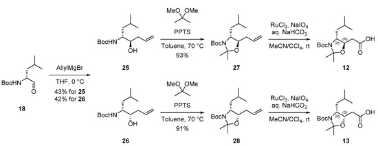 Following the preparation of intermediate (3R,4S)-11, we focused on the synthesizing unnatural Sta precursors (3R,4R)-12 and (3S,4R)-13, which serve as key fragments for izenamide B variants (5) and (6). Commercially available aldehyde 18 was reacted with the Grignard reagent [29], which led to the nucleophilic addition of allylMgBr to N-Boc-d-leucinal 18 at 0 °C. Diastereomeric mixtures of alcohols 25 and 26 were obtained in 43% and 42% yield, respectively. The structure and stereochemistry of both alcohol 25 and 26 were confirmed by comparison of their spectral data with those of the corresponding enantiomers, including the opposite optical rotation [30]. Acetonide protection of optically pure allylic alcohols 25 and 26 followed by the Ru-mediated oxidation of the terminal alkenes afforded the desired diastereomeric Sta precursors (3R,4R)-12 and (3S,4R)-13, respectively (Scheme 3).