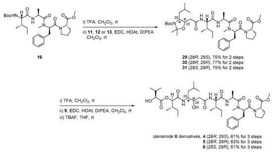 Using diastereomeric Sta precursors 11–13, we assembled fragments for the izenamide B variants (4–6), as shown in Scheme 4. Boc-deprotection of tetrapeptide 16 with TFA and then amide coupling with the diastereomeric Sta precursors 11–13 afforded pentamers 29–31 in yields of 75–77% over two steps. Global deprotection of pentamers 29–31 with TFA and EDC-mediated coupling of the resulting amines with acid 9 produced the corresponding heptamers. Finally, the desired izenamide B variants (4–6) were obtained by desilylation in yields of 61–63% over three steps.
