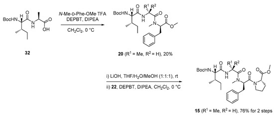 Tripeptide 20 was synthesized by coupling the known acid 32 [27] with N-Me-d-Phe-OMe·TFA salt [27]. The ester hydrolysis of tripeptide 20 and subsequent amidation of the resulting acid with 22 afforded tetrapeptide 15 in a yield of 76% over two steps (Scheme 5).