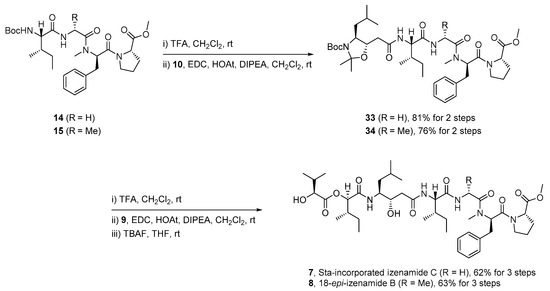 Tetrapeptide 14, acid 9, and natural Sta precursor 10 were prepared following a previously reported synthetic protocol [27]. The synthesis of izenamide variants 7 and 8 (Scheme 6) was completed by Boc-deprotection of tetrapeptides 14 and 15 and subsequent EDC-mediated amide coupling with acid 10. Pentamer intermediates 33 and 34 were obtained in yields of 81% and 76%, respectively, in two steps. The global deprotection of pentamers 33 and 34 and subsequent amide coupling of the resulting amines with acid 9 produced the corresponding heptamers, which were subjected to desilylation to afford Sta-incorporated izenamide C (7) and 18-epi-izenamide B (8) in yields of 62% and 63% over three steps, respectively (All spectral data including 1H, 13C NMR and HRMS of izenamides (4–8) was in Supplementary Materials).