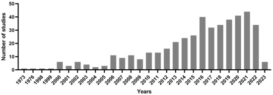 An analysis of the PubMed online database revealed 398 surveys conducted between 1973 and 2023 that have examined the anti-cancer properties of sea cucumbers. The number of studies on sea cucumberβs anti-cancer properties is depicted in Figure 1.