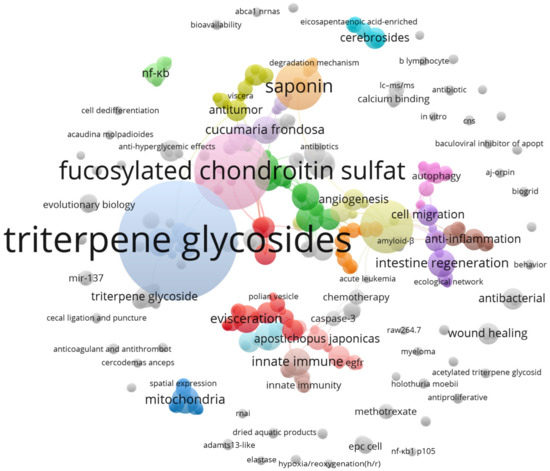 Next, we analyzed the resulting publications using VOSviewer software (v.1.6.8, 2018) [21], which can analyze the semantic contents of publication titles, keywords, and abstracts, and then relate them to citation count data. The software produced a bubble map that revealed the most frequent compounds that have been studied for their anti-cancer properties in sea cucumber extracts.