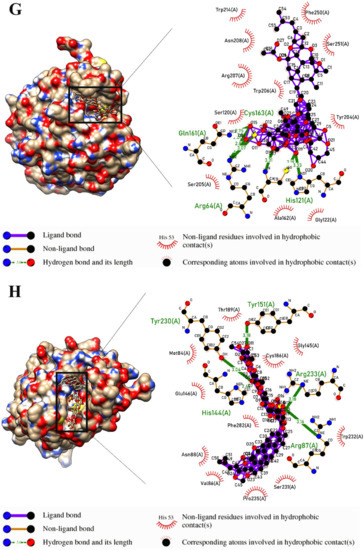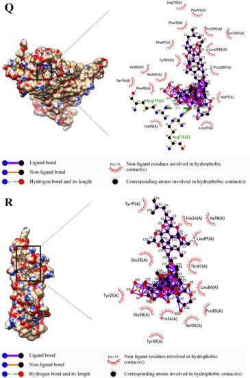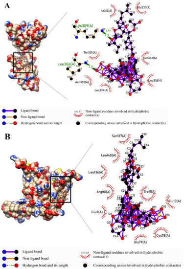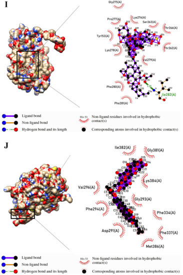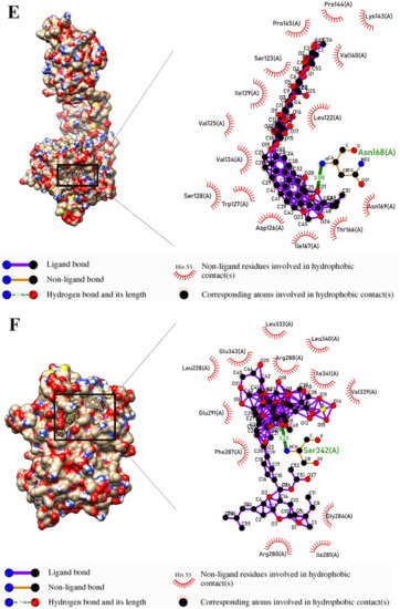 - Laskowski, R.A.; Swindells, M.B. LigPlot+: Multiple LigandβProtein Interaction Diagrams for Drug Discovery; ACS Publications: Washington, DC, USA, 2011. [Google Scholar] [CrossRef]