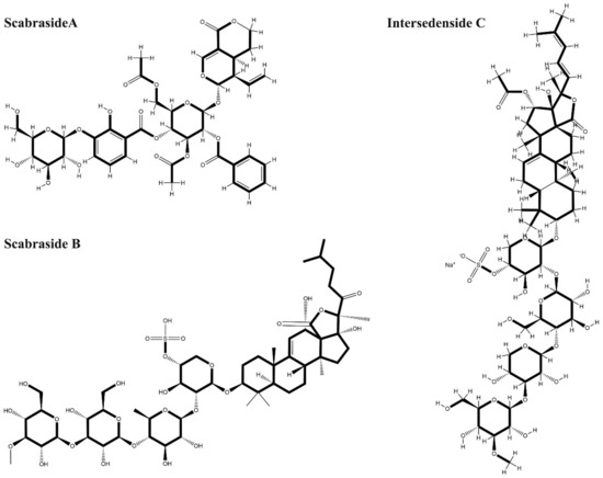 - Mondol, M.A.M.; Shin, H.J.; Rahman, M.A.; Islam, M.T. Sea cucumber glycosides: Chemical structures, producing species and important biological properties. Mar. Drugs 2017, 15, 317. [Google Scholar] [CrossRef]