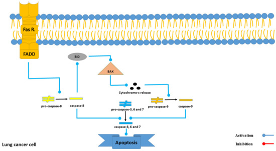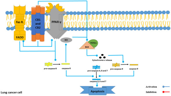 Both CB1 and CB2 receptors are involved in inducing apoptosis through several mechanisms, including the activation of Fas/FasL, activation of PPARΞ³, downregulation of Bcl-2, and upregulation of Noxa [35]. On the other hand, Intercedenside C displayed the highest binding affinity to both receptors, with binding energies of β10.61 and β11.86 Kcal/mole, respectively. Thus, our in silico examination demonstrates the tendency of the abovementioned compounds to bind to the mentioned receptor but the need for more research (in both in vitro and in vivo conditions) in order to prove this affinity still exists. Moreover, detailed roles of both receptors in the apoptotic pathway in lung cancer cells are displayed in Figure 9.