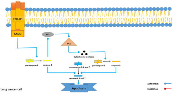 Among all mentioned 22 triterpene glycosides in sea cucumber extracts with anti-lung cancer activity (see Table 3), Intercedenside C exhibits the highest binding affinity to TNFR1 with a value of β13.39 Kcal/mole. Based on prior surveys, the activation of TNFR1 leads to the activation of FADD, which subsequently results in apoptosis in lung cancer cells [29]. Notably, despite the high tendency of Intercedenside C towards TNFR1, the need for more in vitro and in vivo surveys in order to examine this tendency exists. Furthermore, the mechanism of TNFR1-induced apoptosis in lung cancer cells is illustrated in Figure 6.