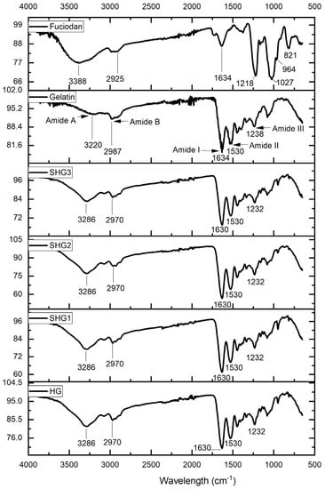 - Szekalska, M.; Citkowska, A.; Wróblewska, M.; Winnicka, K. The Impact of Gelatin on the Pharmaceutical Characteristics of Fucoidan Microspheres with Posaconazole. Materials 2021, 14, 4087. [Google Scholar] [CrossRef] [PubMed]