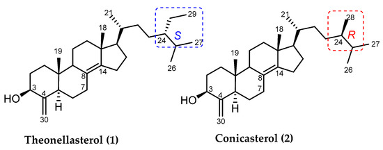 Among 4-exo-methylene sterols, theonellasterol (1) and conicasterol (2), reported for the first time by Djerassi et al. [1], are also 24-alkylated derivatives, and specifically theonellasterol (1) with the (24S)-ethyl group represents the biomarker of the species T. swinhoei, whereas conicasterol (2), with the (24R)-methyl group, is the biomarker of the T. conica species. As structural features, both molecules share the same tetracyclic core bearing the β-hydroxyl group at C-3, the unusual exo-methylene functionality at C-4, and the rare ∆8,14 double bond (Figure 1).