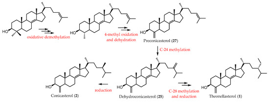 Preconicasterol (27), featuring a Δ24 double bond, represents the first example of 4-methylene steroid without any branching in the side chain [21] while dehydroconicasterol (25) shows an additional exo-methylene group at C-24 [22]. As reported in Figure 4, preconicasterol (27) should be considered the biogenetic precursor of the branched dehydroconicasterol (25) that, in turn, subjected to reduction and/or transmethylation with S-adenosylmethionine, led to the formation of conicasterol (2) or theonellasterol (1) [21].