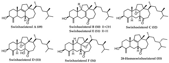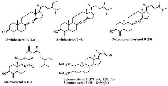Steroids isolated from sponge are often characterized by the presence of unusual structural chemical features, such as additional oxygenation on the tetracyclic nucleus and on the side chain, sulfate esterification, alkylation or truncation of the side chain, unsaturation in the ring D, or secostructures with cleavage in the rings of the tetracyclic core [40]. This is the case of swinhosterols (43–45), unconventional steroids with the 4-exo-methylene and the 8–14 seco-8,14-dione functions (Figure 6). The structural modification of the basic carbon skeleton, with the cleavage of the six membered ring C, arises from the oxidation of the double bond between C-8 and C-14 [41].